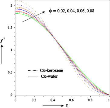 We have represented the temperature profiles against η for various values of nanoparticle volume fraction φ in Figure 5(a) and Figure 5(b) for both S < 0 and S > 0 respectively. Fig. 5(a) shows that the fluid temperature possesses high value because of increasing values of φ for S < 0 i.e., the squeezing flow. The reason behind the phenomena is that when two plates move to each other and nanoparticle volume increases then there are more collision between nanoparticles and particles with the boundary surface of the plate and consequently the resulting friction gives rise to increase the temperature within the fluid near the boundary region. It should be noted that fluid temperature of Cu-kerosene is significantly increased as compared to Cu-water. Higher values of Prandtl number of kerosene are responsible for this phenomenon. But the result is totally opposite for S > 0 i.e., when two plates move apart. On the other hand Nusselt number increases with φ for both nanofluids as shown in Table 7.