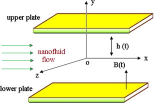 Consider the viscous incompressible nanofluid flow and heat transfer in a two dimensional co-ordinate system. The co-ordinate system is chosen in such a way that x-axis is measured along the plate and y axis is normal to the plate as shown in Fig. 1. The squeezing flow has been performed through a system having two parallel plates situated at distance apart where refers to the squeezing movement of both plates with velocity until they touch each other at . Also refers to movement of the plate away to each other and is called the characteristic parameter having dimension of time inverse. H is the initial position of the plate at time t = 0. A uniform magnetic field of strength is applied normal to the plate where is the initial intensity of the magnetic field. In the mathematical formulation scheme we proceed with the 0 following assumption that there is no chemical reaction, radiative heat transfer, nanoparticles and base fluid are in thermal equilibrium and no slip occurs between them. All body forces are assumed to be neglected. Here we have considered two types of nanofluids cu-water and cu-kerosene. The thermophysical properties of the nanofluid are given in Table 1.