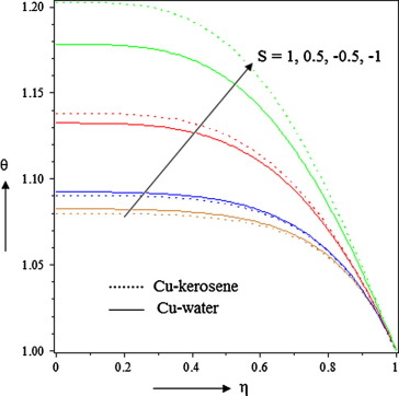 Fig. 3 shows that the nanofluid temperature decreases as S increases. Since hence increase in the squeezing parameter S represents the decrease in kinematic viscosity as well as the speed at which the plates move apart. Consequently the friction between the boundary surface of the plates and nanoparticles reduces and so the temperature of the nanofluid. This result is found to be identical with Mustafa et al. [10]. Table 5 shows that Nusselt number decreases with increasing S for both Cu-water and Cu-kerosene.