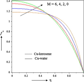 Figure 7(a) and Figure 7(b) exhibits that the temperature of the nanofluid decreases as Hartmann number increases for both S < 0 and S > 0. For S < 0 the effect is more prominent and temperature of Cu-kerosene is higher than Cu-water nanofluid. The effect is opposite for S > 0. It is worth mentioning that for S > 0 we see a crossover of temperature profile at η = 0.82 (not accurately determined). But after that region the effect is negligible. From Table 7 we see that Nusselt number increases as M increases.