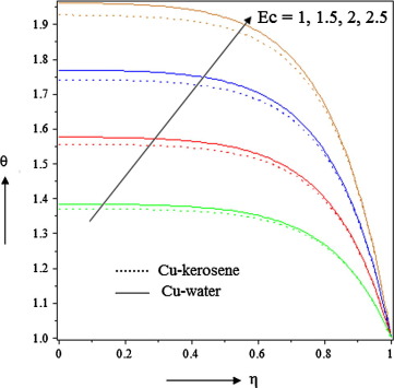 The influence of Eckert number Ec on nanofluid temperature profile has been portrayed in Figure 8(a) and Figure 8(b) for both S > 0 and S < 0. It reveals that the temperature significantly increases with the increasing value of Ec by means of frictional heating. Also the Nusselt number increases as Ec increases for both S > 0 and S < 0 as shown in Table 7. It should be noted that Cu-kerosene possess higher temperature than Cu-water for S < 0. But the reverse effect is seen for S > 0.
