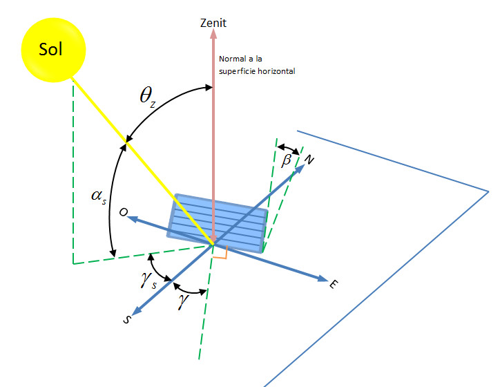 (Ángulo del zenit), el ángulo entre la vertical y una línea con el sol, es decir, el ángulo de incidencia del haz de radiación solar sobre una superficie horizontal.