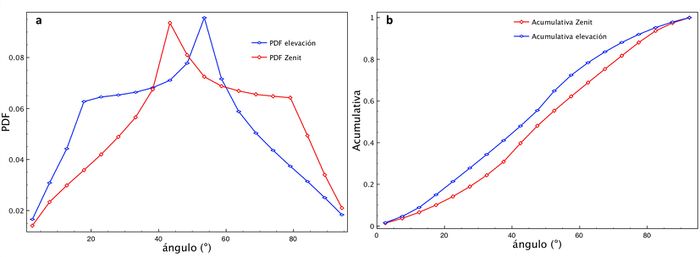Los valores del ángulo de zenit fueron obtenidos por medio de la ecuación (2). Los resultados correspondientes se muestran como histogramas en la Figura 5(a). En dicha figura se observa que los ángulos del zenit (curva roja) de mayor frecuencia están en el intervalo entre 40º y 45º, y se observa una frecuencia de valores del zenit con mínima variación en el intervalo de 60º a 80º. Para el caso del ángulo de altitud (curva azul), la frecuencia es mayor en el intervalo de 50º a 55º, y mínima variación de la frecuencia en el intervalo de 20º a 40º, lo cual es congruente dada la relación entre altitud y zenit. En la Figura 5(b) se muestran los valores acumulativos de la gráfica 5(a), que en este caso corresponden a la probabilidad de que el ángulo del zenit o elevación esté dentro de un intervalo particular. Por ejemplo, se tiene una probabilidad de aproximadamente 0.18 de que al medir el ángulo de elevación éste se encuentre dentro del intervalo entre 0º y 20º. Los resultados mostrados en la Figura 5 son una representación estadística, pero para fines prácticos, son poco útiles. Más adelante mostramos resultados con mayor potencial de aplicación.