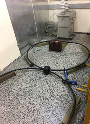 Para aplicar tensión al circuito de prueba, se utiliza un transformador de 20 kVA de tensión nominal 225/34.500 V. Este transformador es conectado a un variac en el lado de baja tensión para ajustar valor de tensión según lo que indica la norma de referencia. Es decir, se establece el valor de tensión en el secundario, al cambiar esta magnitud en el primario teniendo en cuenta la relación de transformación de este equipo. Por otra parte, mediante en el uso de un transformador de potencial se verifica la tensión que se aplica al conductor bajo prueba (el dummy, como se mencionó anteriormente, no es conectado a este circuito) y se conecta directamente al núcleo de cobre del condcutor aisaldo con XLPE, específicamente, en los terminales donde se cierra la espira que forma el cable (Figura 4).