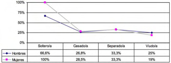 No se dan asociaciones significativas en relación a la edad [?2(4)=5.663, p>.05], el estado civil [?2(3)=6.646, p>.05], la forma de convivencia [?2(1) =1.599, p>.05] y el lugar de residencia [?2(2)= 1.165, p>.05].