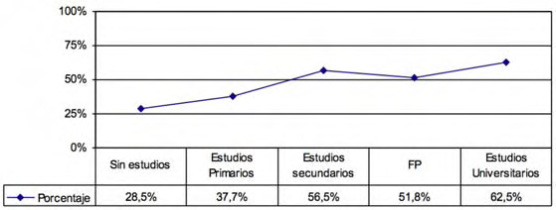 Como se observa, son las personas mayores con estudios secundarios (56,5%) y universitarios (62,5%) los que presentan porcentajes más altos de uso de este recurso: Internet. Seguido de los mayores con formación profesional (51,8%), estudios primarios (37,7%) y sin estudios (28,5%).
