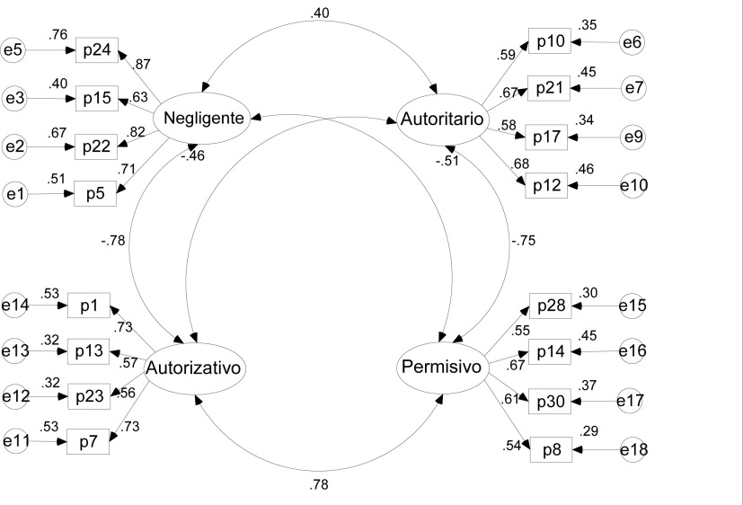 Ambos modelos presentaron buen ajuste a los datos, pero el modelo de cuatro factores requirió la eliminación de tres reactivos del estilo autoritario, dos del negligente y del autorizativo y uno reactivo del permisivo (ver Figura 1 y Apéndice).