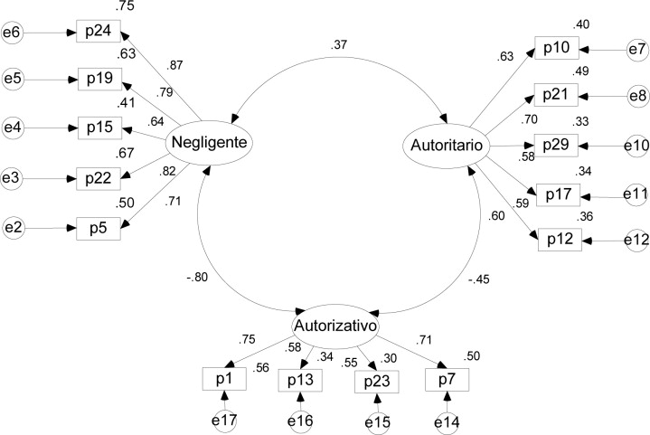 Por su parte el ajuste del modelo de tres factores requirió la eliminación de dos reactivos del autoritario y dos del autorizativo, así como un reactivo del negligente (ver Figura 2 ). Los índices de ajuste de los dos modelos se muestran en la Tabla 2 .