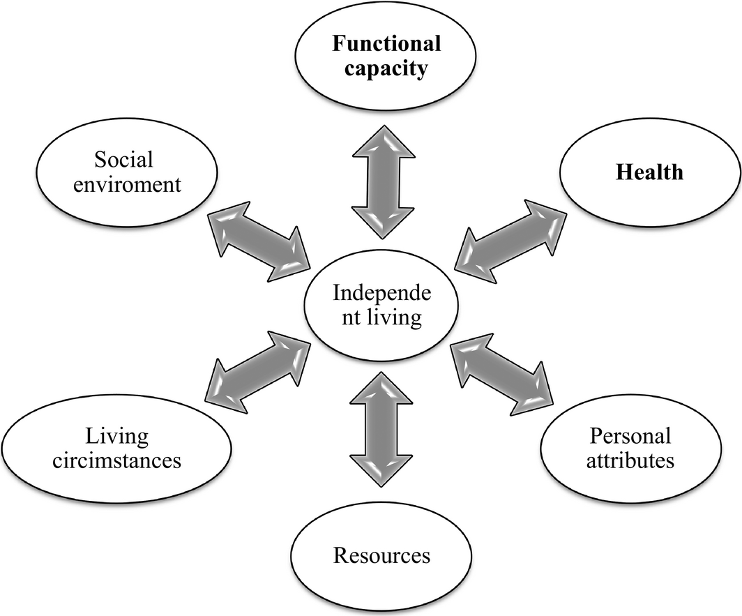 Figure 1. Factors associated with independent living based on previous studies (the main interests in this study are highlighted). |