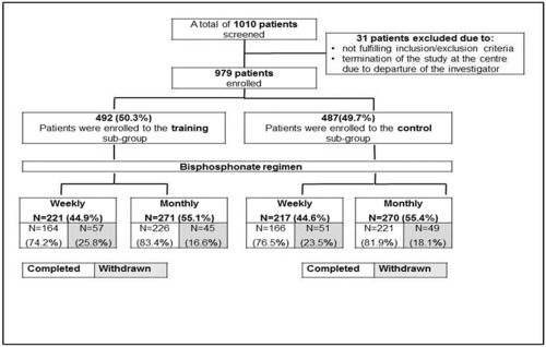 A total of 979 patients with postmenopausal osteoporosis (mean age: 63.2 ± 7.2 years) were included in this national, multicenter, prospective non-interventional observational cohort registry study. Patients were randomized into training (n = 492, 50.3%, mean age: 63.4 ± 7.2 years) and control (n = 487, 49.7%, mean age: 63.0 ± 7.1 years) groups. Patients in each intervention group were given weekly (44.9% and 44.6% for training and control subjects, respectively) or monthly (55.1% and 55.4%, respectively) bisphosphonate regimens. After the initial visit, patients were followed up at three-month intervals throughout 12 months of treatment for evaluation of persistence, compliance and adverse events.