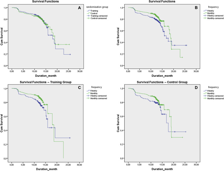 Fig. 2. Treatment persistence: a) in training vs control groups, b) in weekly vs monthly treatment regimen in the overall population, c) in weekly vs monthly treatment regimen in the training group, d) in weekly vs monthly treatment regimen in the control group. Log-rank Mantel–Cox test of equality of survival distributions for the different levels of frequency: = 0.001, df = 1, p = 0.971; = 7.267, df = 1, p = 0.007; = 4.695, df = 1, p = 0.030; = 2.697, df = 1, p = 0.101. |