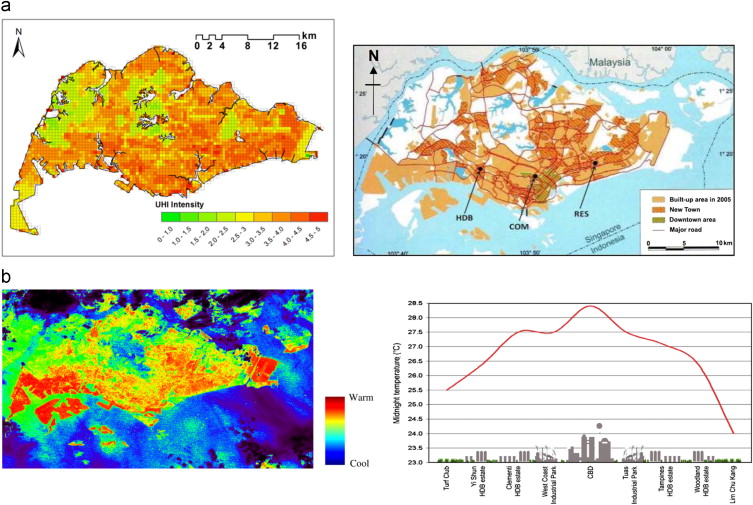 Figure 4. (a) UHI intensity map of Singapore (De Koninck et al., 2008 ) and (b) UHI profile of Singapore (Priyadarsini et al., 2008 ). |