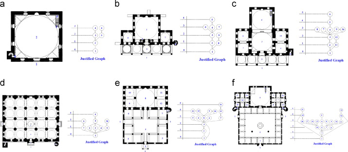 Figure 8. Justified permeability graphs (gamma analysis method) of mosque layouts (six case studies/categories). |
