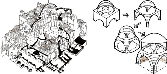 Figure 1. Pendentive dome construction: Hagia Sophia (left); types of pendentive dome construction (right). |