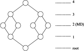 The depth of the diamond-shaped graph represents an intermediate situation between the maximum mean depth of space when the spaces are organized in a linear sequence with respect to the root space (as previously mentioned) and the least mean of depth when all spaces are linked directly to the root space (Hillier and Hanson, 1988 ). Therefore, RRA can be calculated as follows:
