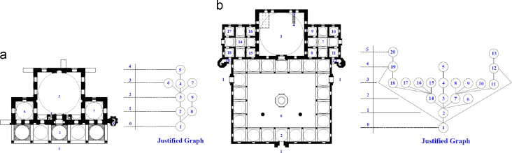 The R values vary around the number one, with the values greater than one corresponding to a high degree of “ringiness” and distributedness of a spatial system (i.e., ringy structure). This distributedness indicates a high degree of flexibility (i.e., functional efficiency) in using the space, enabling the user (i.e., prayer) to change the layout to adapt to different circumstances by closing or opening doors. A value less than one indicates that the spatial system has a tree-like structure, suggesting the lack of distributedness and the increase in the depth of spaces within the mosque layout ( Guney, 2005 ; Bellal, 2007 ). R can be calculated as follows: