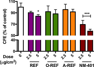 To deepen the investigation of the effect of functionalization on cell viability, the different MWCNT preparations (2.5–5 μg/cm2 ) were studied with a CFE assay on A549 (Fig. 7 ). Only the REF preparation determined a significant decrease of colony number at the highest dose tested of 5 μg/cm2 , while the other MWCNT did not produce significant effects. The rank of the effect was confirmed at 10 μg/cm2 (REF 78.3 ± 6.4, n = 3, p < 0.05; O-REF 87.2 ± 10.3, n = 3, n.s.; A-REF 94.7 ± 15.9, n = 3, n.s.). The benchmark material NM-401 induced a significant dose dependent decrease of colony number up to 45% at the highest dose tested of 5 μg/cm2 .