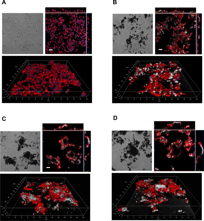Fig. 9. Contrast phase (top left) and confocal images (top right and bottom) of Raw264.7 cells exposed to REF (panel B), O-REF (panel C) and A-REF (panel D) MWCNT. Cells were treated with 80 μg/cm2 of each MWCNT preparation for 24 h and labelled as described in Methods. The same representative fields are shown in contrast phase (left) and confocal microscopy (right). For each condition, a single horizontal confocal section is shown along with two orthogonal projections. White, MWCNT (reflection mode); blue, nuclei; red, cytoplasm. Bars = 20 μm. (For interpretation of the references to color in this figure legend, the reader is referred to the web version of this article.) |