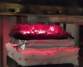 A continuación, se ha secado el prepreg para alcanzar su estado de polimerización B, para lo que se ha utilizado un equipo de laminación continua modelo Reliant Powerbond, que cuenta con un túnel de laminación de 3m de largo y en el que el preimpregnado ha alcanzado una temperatura media de 80ºC, para evitar que el agua de la resina de furánica hierva durante el secado.