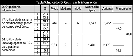 En el siguiente indicador, D: Organizar la información, encontramos los resultados de autopercepción más bajos de todos, tal y como se puede apreciar en la tabla 5 de la página siguiente.