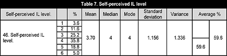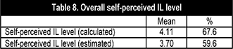 Here we observe a certain tendency towards central scores, with an average of 3.70 and a percentage of 59.6%, which is slightly lower than would be expected from the results from each indicator individually. As we can see in table 8, the average self-perceived IL level from all the indicators (76.6%) was eight points lower than the estimated self-perceived IL level from the overall assessment.