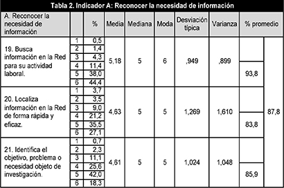 En la tabla 2 mostramos los resultados obtenidos para las preguntas relacionadas con el indicador A: Reconocer la necesidad de información.