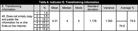 The results for the final indicator (Indicator E), on transforming information, show that only 74% of secondary school teachers in Spain are able to convert the information obtained from their Internet searches into their own content (table 6, see in next page).