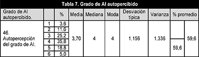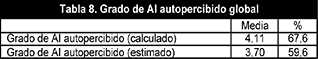 Tras las diferentes preguntas asociadas a los cinco indicadores de la AI, quisimos recoger en una pregunta final de autopercepción, una valoración global del grado de AI autopercibido por el profesorado de Educación Secundaria del estado español tras haberles mostrado en el cuestionario una definición de lo que entendemos por AI. Los resultados obtenidos en dicha pregunta se muestran en la tabla 7.En sus respuestas a esta pregunta global encontramos cierta tendencia hacia los valores centrales, resultando una media de 3,70 y un porcentaje del 59,6%, ligeramente inferior a lo que cabría esperar tras haber ido observando los resultados obtenidos para cada uno de los indicadores. Tal y como podemos observar en la Tabla 8 el grado de AI autopercibido obtenido del promedio de todos los indicadores, 67,6%, disminuye ocho puntos respecto al grado de AI autopercibido y estimado en la pregunta global.