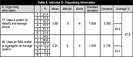For the next indicator (indicator D), the results on self-perception were the lowest of all (table 5). Although the range of responses was wide (with standard deviations of 1.839 and 1.476), for the two questions on ability to organize information, the percentages (49.0% and 14.75%) and means (3.50 and 2.31) were the lowest results of the entire questionnaire. Less than half the teachers use a system for classifying and managing email and very few know or use any type of content reader or aggregator.