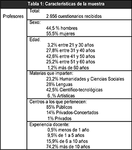 La población total de profesorado de Educación Secundaria del estado español según los últimos datos estadísticos desglosados y disponibles del Ministerio de Educación son los del curso escolar 2011-12 y en ellos se constata que el total asciende a 289.027 docentes. Tras haberse enviado invitaciones a la participación en este estudio a todos los centros de Educación Secundaria del país el cuestionario estuvo disponible on-line para su cumplimentación en 2013, obteniéndose 2.656 respuestas válidas. La muestra de 2.656 sujetos cuenta con un intervalo de confianza del 1.9678, un error muestral del 0.019 y una variabilidad del 0.5. Las características de la muestra se detallan en la tabla 1.