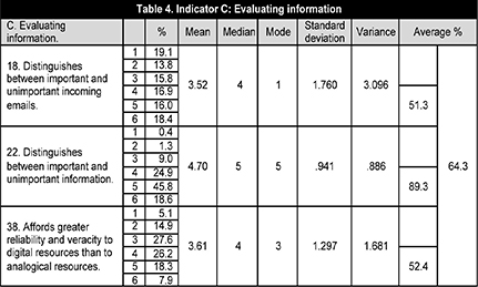 The results for the third indicator (indicator C), on evaluating information, were similar to those for indicator B (table 4). While the average percentage for the responses was considerably lower (64.3%), we also find the lowest range of responses for one item and the widest range of those for another in the same indicator. For example, the responses of the secondary school teachers with regard to their ability to distinguish between important and non-important incoming email messages varied widely (with one of the highest standard deviations of the whole questionnaire (1.760), a median of 4 and a mode of 1). On the other hand, the same Spanish secondary school teachers agreed on their ability to distinguish between important information and non-important information, recording one of the highest percentages on this item (89.3%) and the lowest standard deviations of the whole questionnaire (0.941). On the other hand, they failed to agree on whether to afford greater reliability and veracity to digital or analogical resources: just over half of those surveyed were in favour of information from digital sources, while the rest were in favour of information from analogical sources.