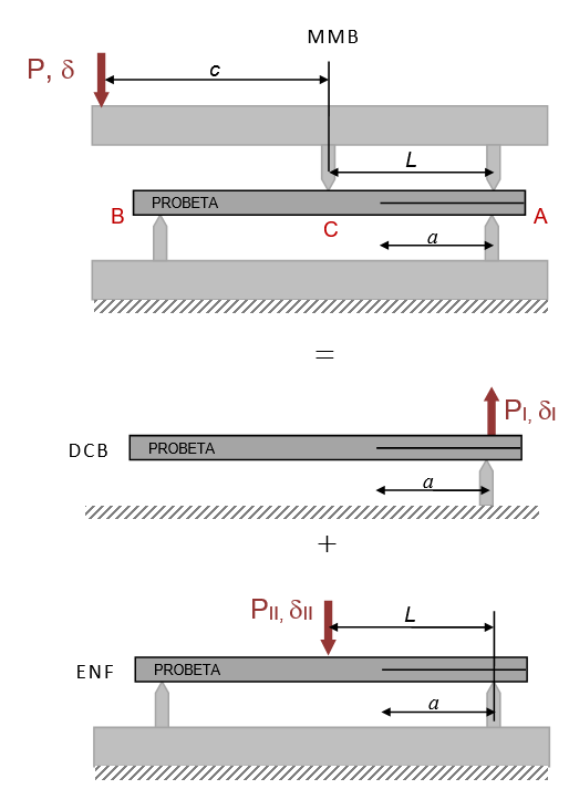 El ensayo MMB es una combinación del ensayo ENF y DCB (Figura 1). Consecuentemente, el sistema de carga y desplazamiento correspondiente al ensayo MMB se puede representar como la superposición de modo I y modo II puro. Las fuerzas correspondientes al modo I y modo II son: