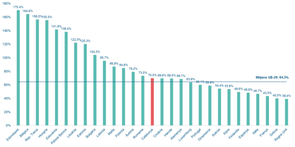 En aquest sentit, Catalunya presenta un grau d’obertura (sumatori d’exportacions i importacions respecte el PIB) del 70,0%, nivell que es situa per sobre de la mitjana de la Unió Europa i de països de dimensió similar com Finlàndia o Dinamarca (veure figura 3).
