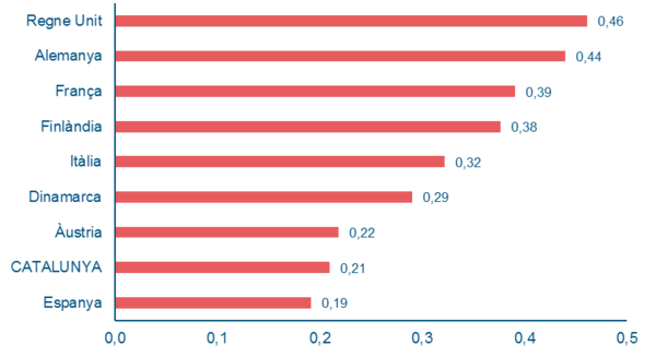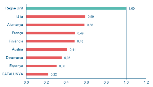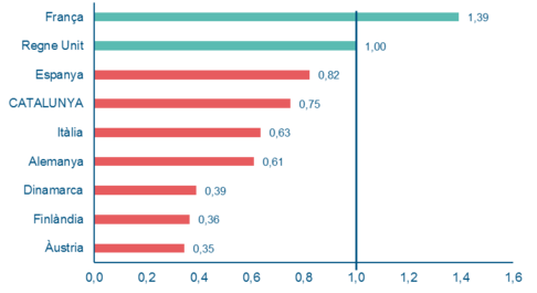 Comparant la intensitat exportadora de Catalunya amb els països de referència (figura 14) s’observa que la majoria dels països europeus presenten també una baixa intensitat exportadora. Únicament França (1,39) i Regne Unit (1,0) registren un índex superior o igual a la unitat. Catalunya registra una intensitat exportadora de 0,75, inferior a la d’Espanya (0,82), però superior a la d’Itàlia (0,63), Alemanya (0,61) i resta de països de dimensió comparable.