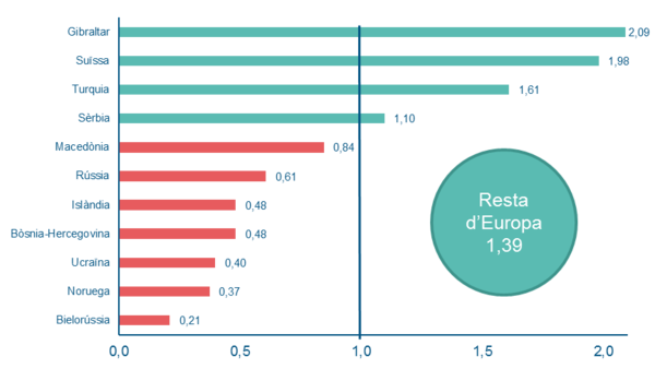 Figura 9. Índex intensitat exportadora de Catalunya, 2016. Països Resta d’Europa
