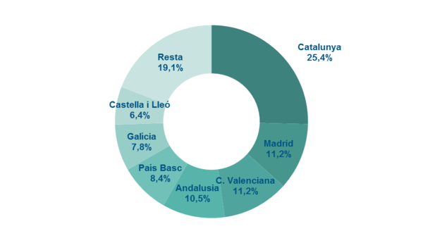 Catalunya lidera les exportacions a l’Estat amb un 25,4% del total el 2016, més del doble que la segona regió, la Comunitat de Madrid (veure figura 2), cosa que evidencia el potencial exportador i la orientació internacional del teixit industrial català.