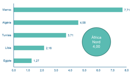 El contrast amb els països de referència (figura 12) permet observar com els països europeus de la Conca Mediterrània presenten una alta intensitat exportadora amb Àfrica del Nord, molt per sobre dels països del nord d’Europa, cosa que evidencia de nou, que la proximitat geogràfica i la vinculació històrica són factors rellevants en les relacions comercials. Catalunya (4,0) es situa per sobre de França (2,95) i Itàlia (2,71), però per sota del conjunt de l’Estat (4,52).