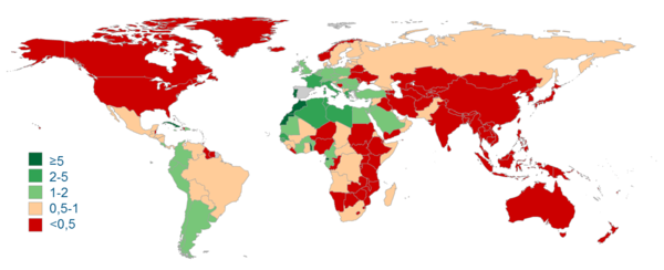 L’índex pren valors entre 0 i ∞. Un índex igual a 1 indica unes exportacions proporcionades, en el sentit que el pes de les exportacions de Catalunya en aquella destinació és el mateix que el pes de les exportacions del món en aquella mateixa destinació. En aquest cas, les exportacions catalanes a un mercat determinat estarien en línia amb la mitjana mundial. Un índex superior (inferior) a 1 indica, en canvi, que les exportacions de Catalunya cap a una regió/país són d’una intensitat alta (superior a 1) o baixa (inferior a 1).