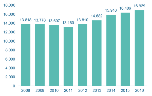 Figura 5. Evolució nombre d’empreses exportadores regulars*, Catalunya. 2008-2016