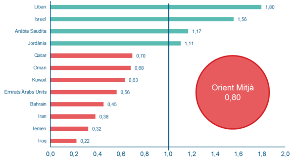 Comparat amb els països europeus de referència, només Regne Unit (1,27) i Itàlia (1,06) presenten una intensitat exportadora amb l’Orient Mitjà per sobre de la unitat. Tanmateix, Catalunya tot i presentar una intensitat exportadora força més baixa i inferior a la unitat (0,80), es situa per sobre del conjunt de l’Estat (0,74) i la resta de països de la UE contemplats. L’assignatura pendent de Catalunya a l’Orient Mitjà es troba a Iran i Emirats Àrabs Units, on la intensitat exportadora és inferior a la de la majoria de països comparats.
