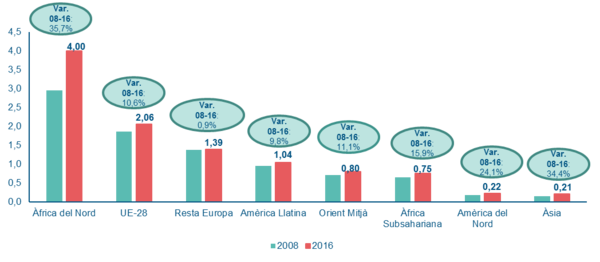 La intensitat exportadora de Catalunya ha crescut en totes les regions mundials des de l’inici de la crisi (veure figura 6). Àfrica del Nord és la regió on s’ha produït el creixement més elevat entre els anys 2008 i 2016 (+35,7%), i és la regió on la intensitat exportadora de Catalunya és més alta (4,0). Les exportacions catalanes també són molt intenses amb la UE (2,05), regió que representa el principal mercat de Catalunya. L’índex d’intensitat exportadora també es troba per sobre de la unitat a la Resta d’Europa (1,39), tot i que ha estat la regió on menys ha crescut la intensitat exportadora (1,5%) des de 2008. Destaca també la intensitat exportadora a Amèrica Llatina, que tot i la distància geogràfica es situa lleugerament per sobre d’1 (1,04), degut a l'afinitat cultural amb la regió.