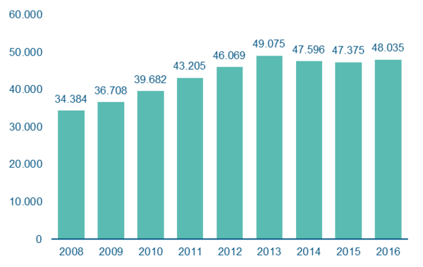 Figura 4. Evolució nombre d’empreses exportadores, Catalunya. 2008-2016