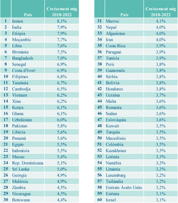 Taula 3. Perspectives de creixement del PIB (mitjana 2018-2022). Rànquing per països