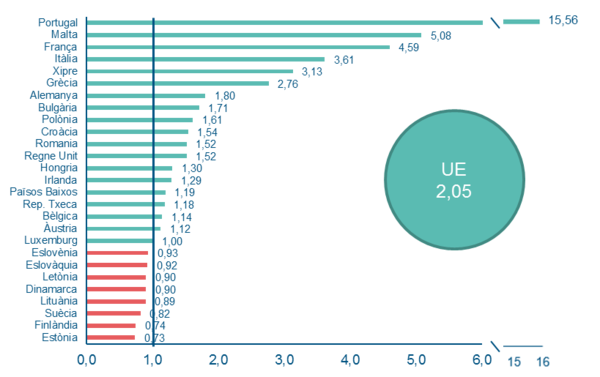 Figura 7. Índex intensitat exportadora de Catalunya, 2016. Països UE