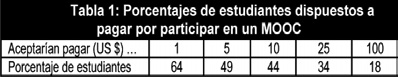 Volviendo a los SPOC, lo que encontramos no es una nueva propuesta o nuevas soluciones docentes, como mantiene Fox, sino un nuevo modelo de negocio que pretende incrementar los retornos. Más claramente: estamos hablando de ganar dinero. En un reciente estudio de un MOOC ofrecido por la Universidad de Pennsylvania (Alcorn & al., 2014), se preguntó a 35.000 estudiantes de entre los que habían completado al menos una lección, cuánto estarían dispuestos a pagar por el curso. Los resultados se muestran en la tabla 1.
