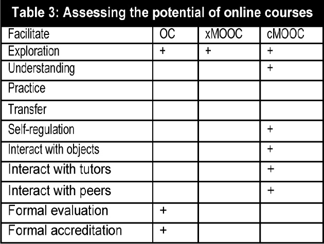 Por supuesto, los TELE que estudiamos no eran MOOC, pero pensamos que es posible extrapolar nuestros resultados. Basándonos en lo que conocemos, hemos tratado de evaluar lo conceptos de cursos tradicionales en línea (OC), xMOOC y cMOOC respecto a su potencial para soportar el aprendizaje en las cuatro fases del aprendizaje así como para potenciar el aprendizaje autorregulado. También medimos su capacidad para interactuar con objetos de aprendizaje, pares y tutores. Finalmente consideramos la importancia de la evaluación formal y la acreditación. Mientras este tema parece ser un problema con los xMOOC, no es relevante con los cMOOC puesto que los participantes en cMOOC parecen estar principalmente interesados en conocer y no en su acreditación. Esto queda documentado en la tabla 3.