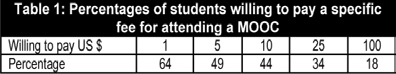 To return to SPOCs: what we find is not a new proposal or the exploration of new teaching solutions, as Fox maintains, but a new business model which aims at increasing returns. Put bluntly, it is about making money. In a recent study of a MOOC offered by the University of Pennsylvania (Alcorn et al., 2014), 35,000 students who had completed at least one lesson were asked how much they were willing to pay for the course. The results obtained are shown in table 1.