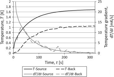 The temperatures in Eq. (5) were calculated from input based on heat transfer through radiation and conduction for set-up 2, with the steel tube at atmospheric pressure. The results are shown in Figure 9 . Both the temperature increase and its time derivative are shown for both the front side (source side) and the back side of the container. It is interesting to see that the derivatives seems to come together and follow the same curve which means that from this point the equation for the two temperature curves are the same, but for a constant. This can also be seen in Eq. (5 ) for the case where Kint is large compared to Kext . The third term in the equation will decline faster than the second term which is the same for both temperatures. After long enough time for the third term to be negligible, the equation for the sensor temperature can be rearranged to Eq. (8) , which is the same as Eq. (3) apart from the constant (Ts 1 −Ts 2 )/ 2. This makes it into an equation with three unknowns of which one, the constant, does not contribute to the solution of the heat capacity.