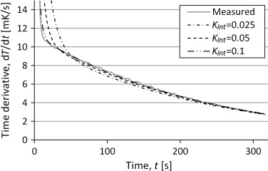 Figure 13. Time derivative of the temperature from simulations of the three lump model with varying internal conductance. Compared to measurements of a silver sample. |