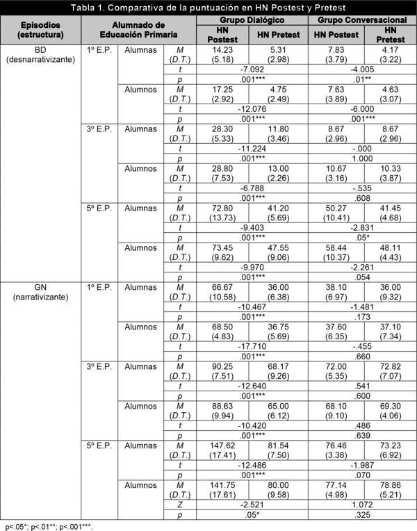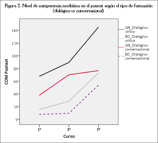 Como se recoge en la Tabla 1, al comparar la puntuación obtenida en competencia mediática entre el postest y el pretest, mediante la prueba t de muestras relacionadas, se constata que la puntuación del grupo dialógico-crítico mejora en el postest, mientras que la puntuación del grupo dialógico-conversacional no es estadísticamente significativa, salvo entre las alumnas y alumnos de 1º y las alumnas de 5º que, en ambos casos, han visualizado episodios de Bola de Dragón (con estructura desnarrativizante).